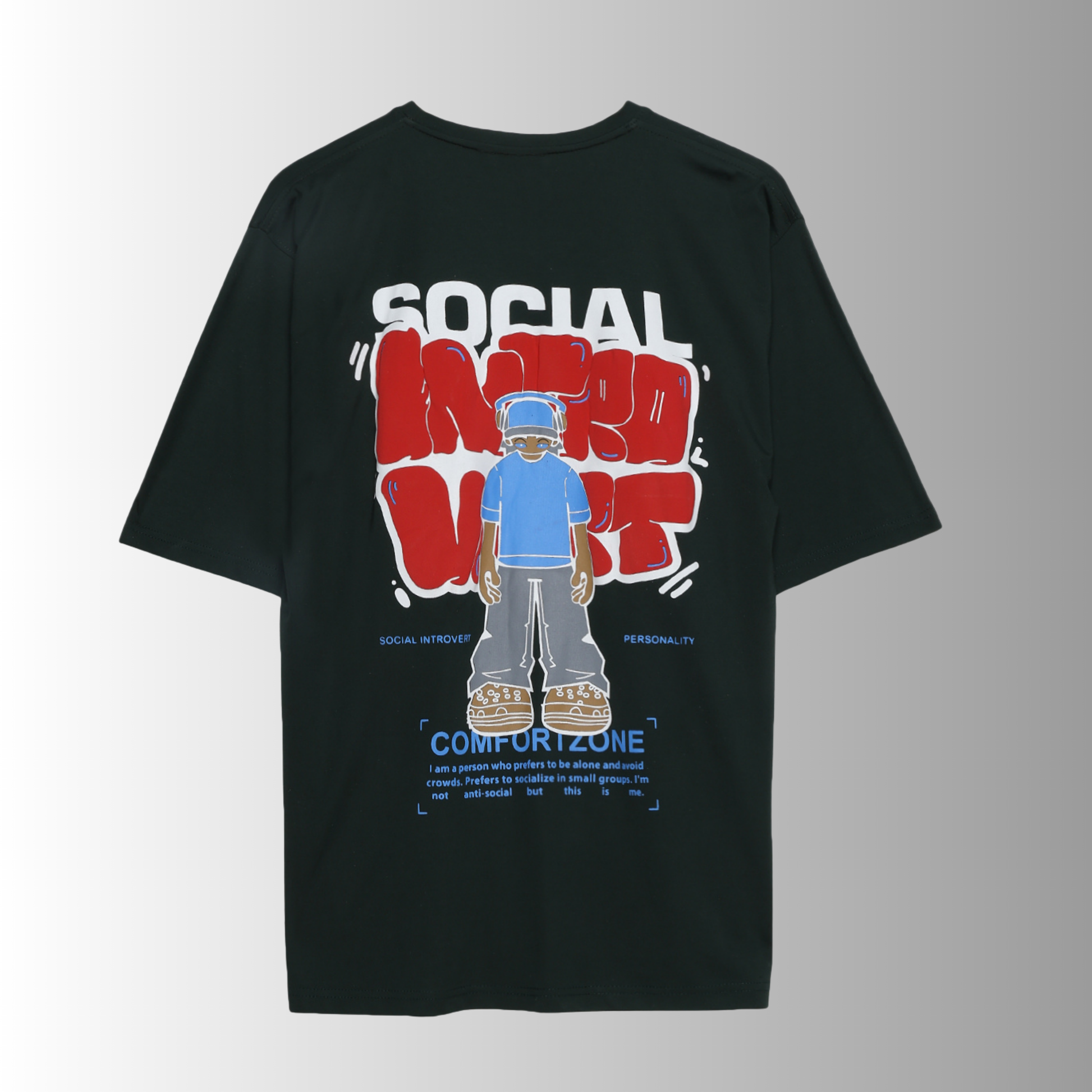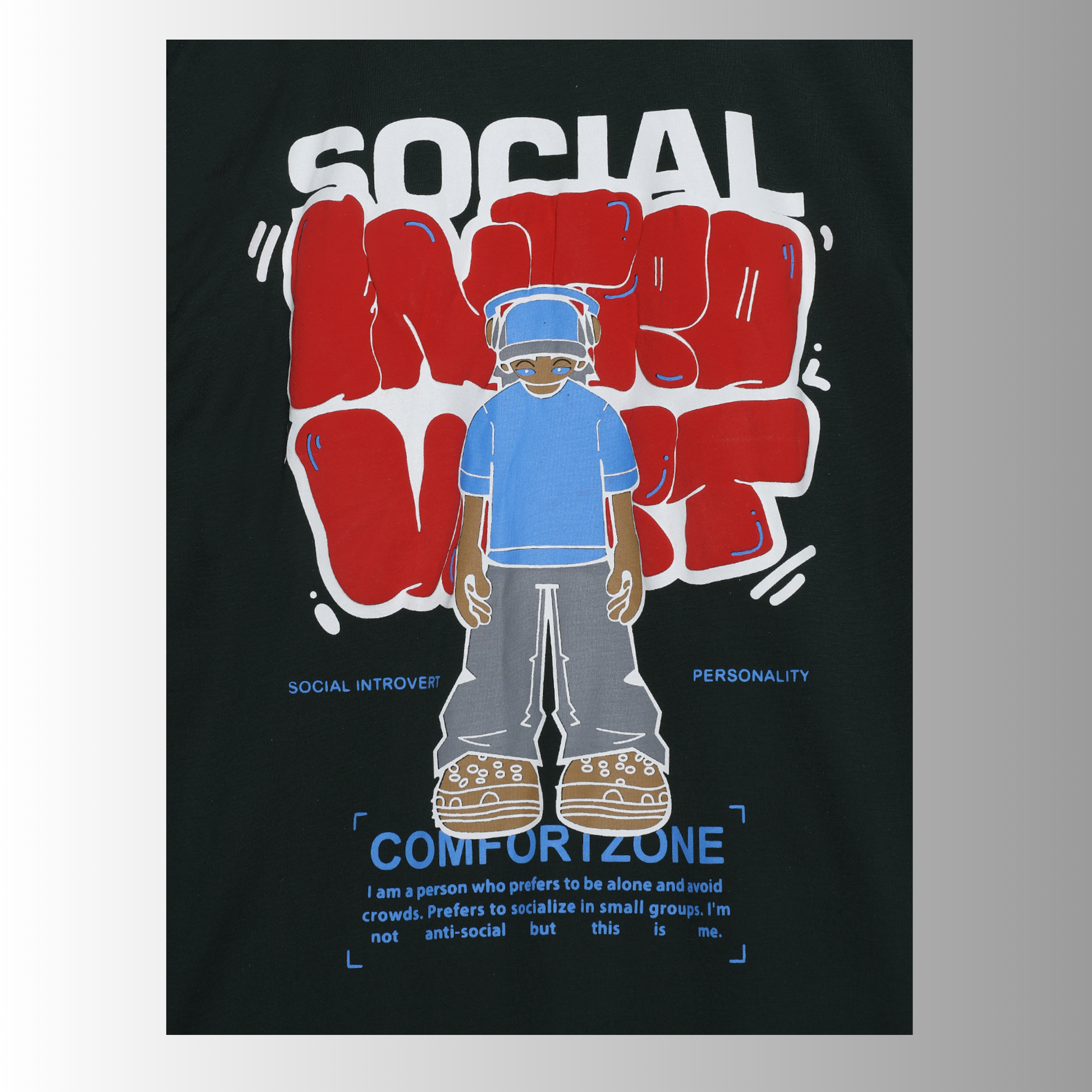 The Social Introvert Oversized Tee blends bold, comic-style artwork with raw self-expression. Featuring a character standing confidently in their comfort zone, the tee declares what many feel but few say out loud: "I’m not anti-social, just selectively social." With graffiti-style lettering, vibrant red and blue pops, and a streetwear silhouette, this piece is both statement and style.